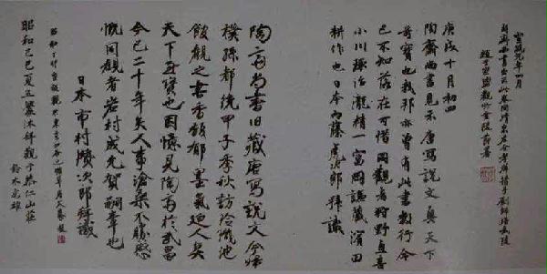 马君衡爰亟涞归之北京大学,余美其缘,适内乱作而止。未几,江藤玄海谓余曰:“内藤湖南博士十七年前曾观此卷于端陶斋所,至今思之不能忘。今闻在君所,已斥其所爱之物,思以相易,君其重斯意。”余感其言,遂以归之。盖余私淑炳卿先生于上虞罗雪堂翁者亦既久矣,然迄今半载,时时往来于胸臆,殆每饭不能忘也。