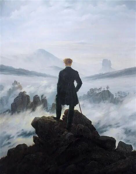 其次,金雯老师以浪漫主义时期的标志性绘画卡斯帕・大卫・弗里德里希(Caspar David Friedrich)的《雾海之上的流浪者》为例,通过画中面对无垠宇宙却能与之抗衡的“超绝人类形象”,指出人类抵抗世界时,只有身体和语言这两种媒介。所以概括来说,现代人类智能的创造力,是以身体和语言为基础,利用其他天然或人造媒介(比如文学)构建知识和社会组织的能力。人以自身为媒介,又创造人造媒介,再把天然媒介、人造媒介与身体、语言勾连,形成一个松散、可变化、能自我颠覆生成、实现秩序化的“装置系统”。