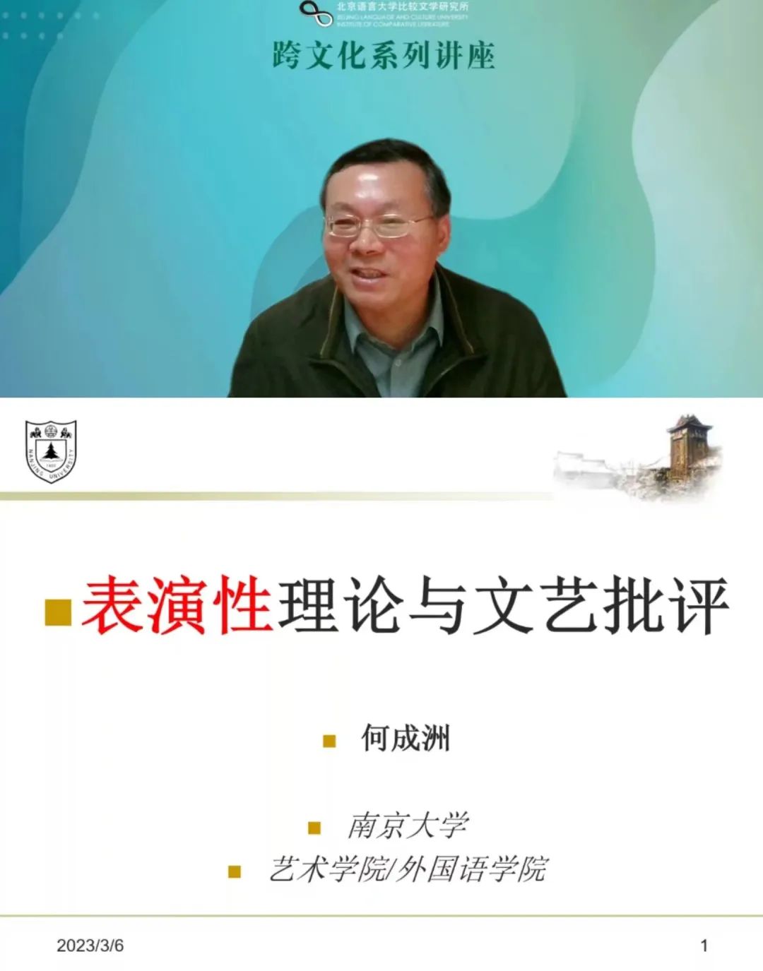 惊蛰起,万物生。2023年3月6日,我们在独属初春的暖意中,迎来了由北京语言大学比较文学研究所主办的“跨文化系列讲座”第111讲。本次讲座在线上举行,主题为“表演性理论与文艺批评”,主讲人为南京大学何成洲教授,主持人为北京语言大学陈戎女教授,与谈人为南京大学戴从容教授与上海交通大学都岚岚教授。